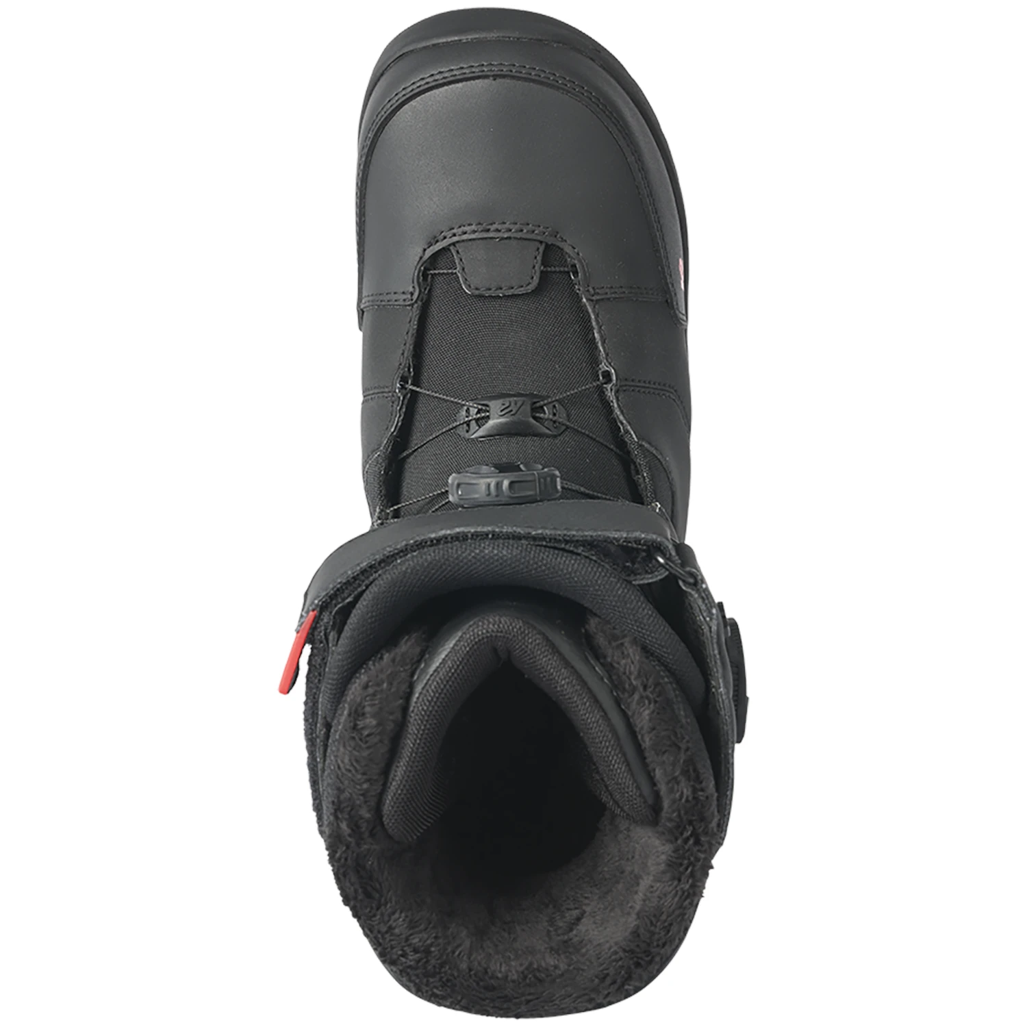 A cable and reel based lacing system that creates even tension and easy lacing operation. This system features low friction guides for even tightening. Boa® works to automatically retract lace slack so your boots stay nice and neat.