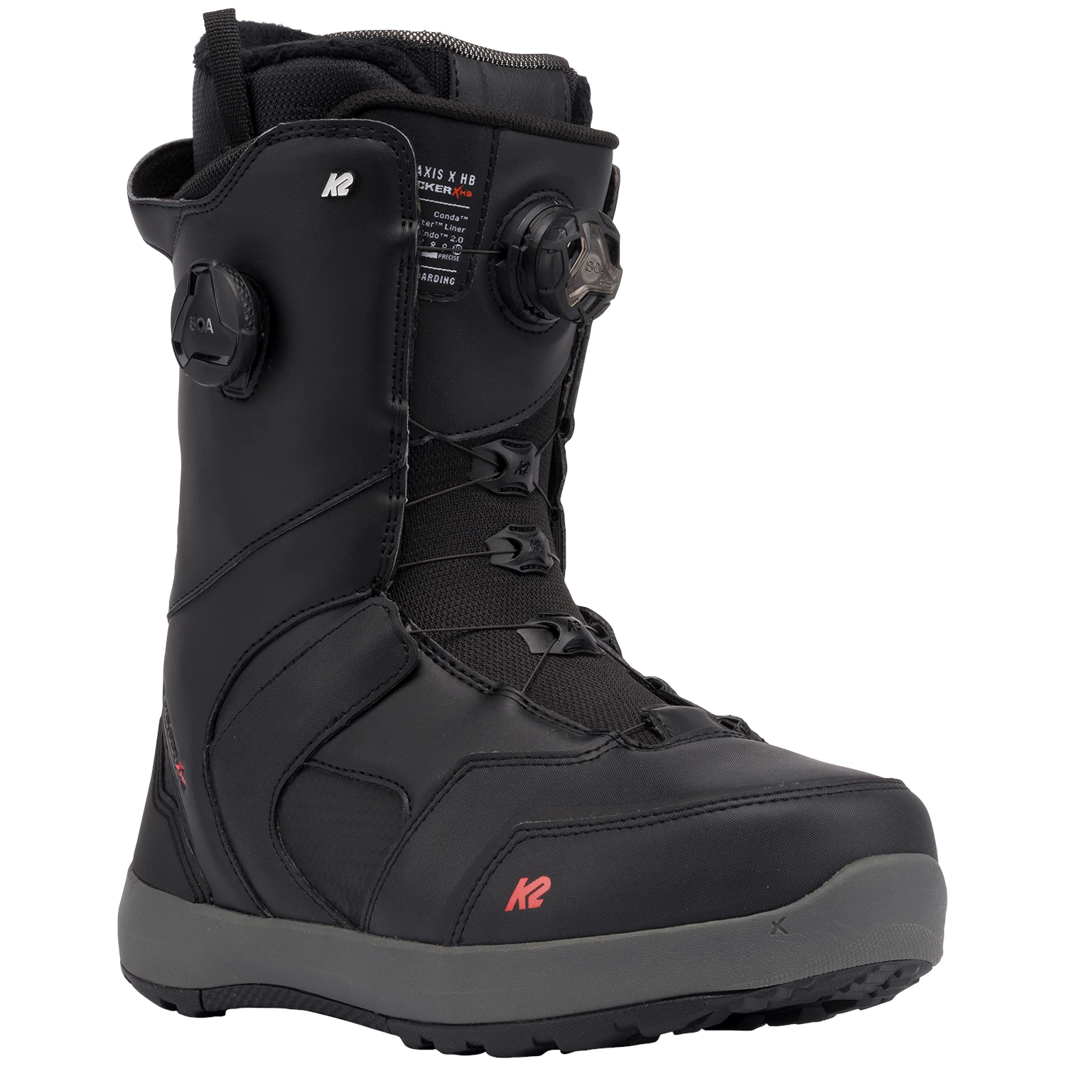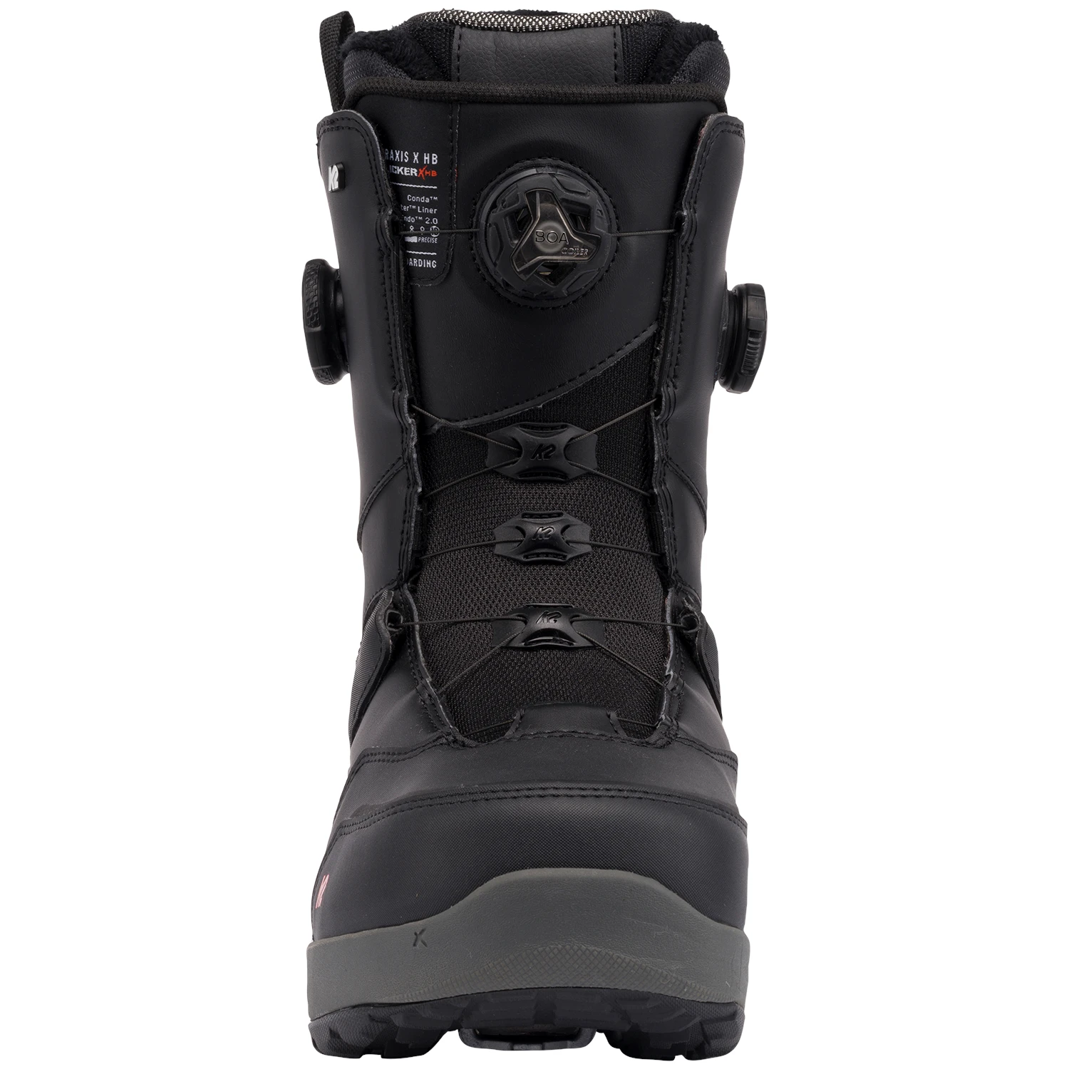A cable and reel based lacing system that creates even tension and easy lacing operation. This system features low friction guides for even tightening. Boa® works to automatically retract lace slack so your boots stay nice and neat.