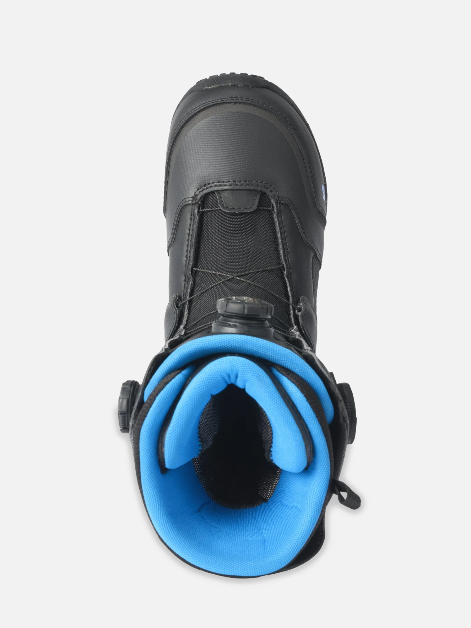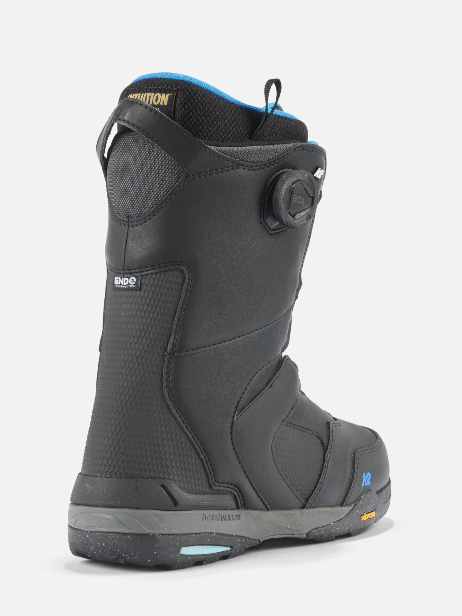 The Thraxis’ Zonal BOA® Fit System features three BOA® dials, two targeting zonal exterior lacing, and one controlled K2’s Conda™ liner lacing system. By placing a soft, urethane “chip” around the 45° degree of the ankle, we’ve allowed riders to micro-adjust their boot fit and eliminate heel lift. Wrapping the foot, we’ve placed our most supportive liner, composed of multiple densities of heat-moldable Intuition® foam. This open-cell foam means that it can be re-molded time and time again to achieve the perfect fit throughout the boot’s life. The liner is outfitted with our breathable and heat reflecting Spaceheater™ material, keeping riders warm and dry all day long. And lastly, we’ve integrated a 95% post-consumer recycled coffee mesh from SCafe™ into the liner to help eliminate unwanted odor after a long day on the hill. Underfoot, the midsole combines a lightweight and stable EVA and Harshmellow™, a proprietary technology that helps absorb impact, increase damping, and provides a “quieter” feel while snowboarding.