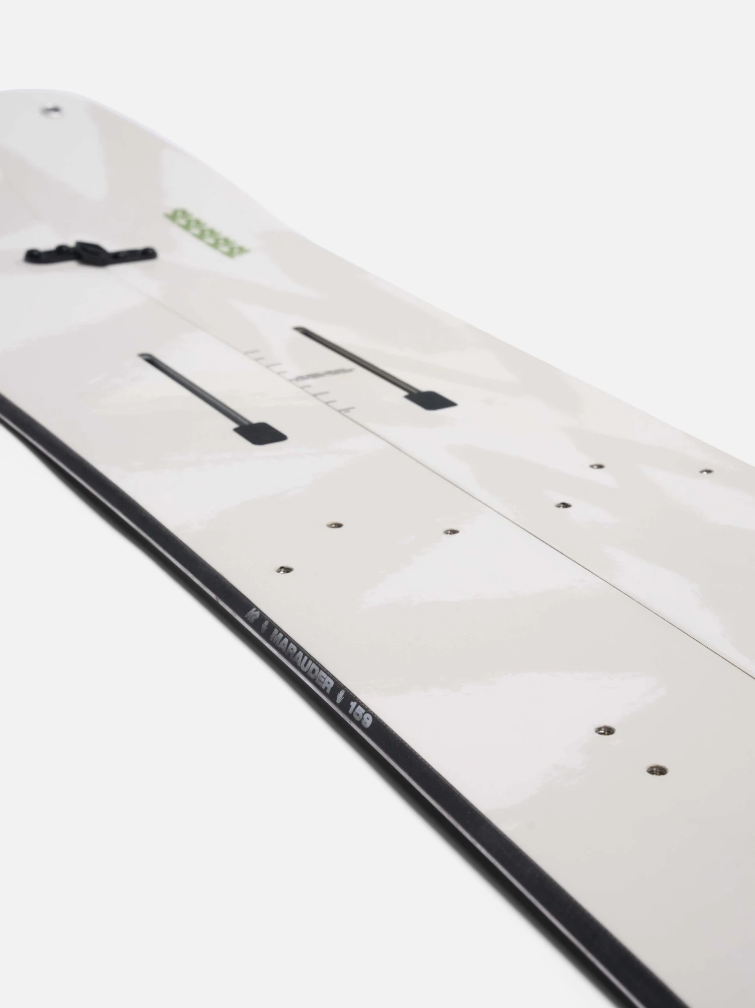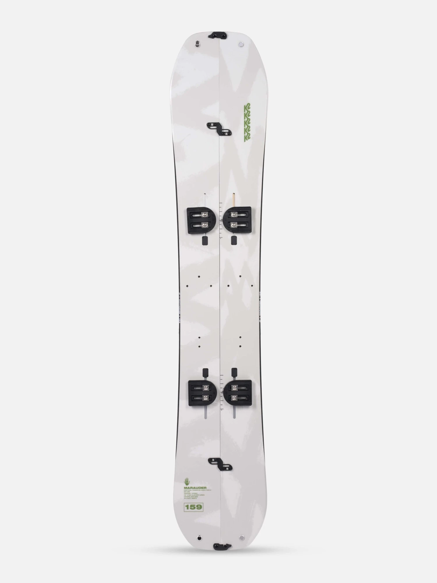 Built as a workhorse to access any backcountry zone, the K2 Marauder Splitboard Package is the perfect partner for the skin track and the reliable atop a steep couloir. The core is built from three species of sustainable timber and is surrounded by our ICG™️ 10 Biaxially Woven Fiberglass with Carbon for stability and snap on both the ascent and descent. Weaving Carbon Fiber stringers into the fiberglass gives the Marauder liveliness without adding extra weight or overdoing it on the torsional rigidity. Our Sintered P-Tex sidewalls are extremely durable, create a smooth, damp feel, and help us reduce overall waste during the manufacturing process. Our tough-as-nails matte top sheet material helps us keep the weight down for cruising on the skin track and our Sintered 4000 base is hard and durable. Simply put, a sintered base retains wax better for long days in the alpine. We know backcountry touring can put a beating on your board both on the way up and on the way back down, so we used a black material along the riding surface for seamless repairs after those inevitable rock encounters.